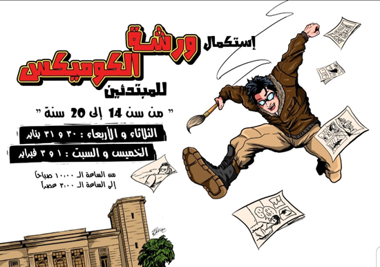 برعاية دكتورة نيفين الكيلاني وزيرة الثقافة يعلن قطاع الفنون التشكيلية برئاسة الدكتور وليد قانوش عن إقامة ورشة الكوميكس للمبتدئين من سن 14 إلى 20 سنة يومي الثلاثاء والأربعاء 30 - 31 يناير والخميس والسبت 1 - 3 فبراير 2024 الساعة 10 صباحاً حتى الساعة 3 عصراً بمتحف الفنون الجميلة بالإسكندرية.