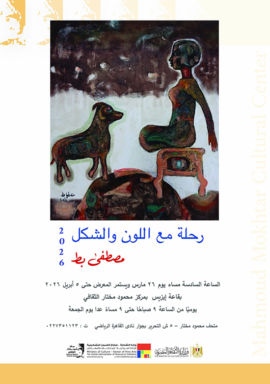 برعاية أ.د/ جيهان زكي وزيرة الثقافة يتشرف قطاع الفنون التشكيلية بدعوتكم لحضور افتتاح معرض `رحلة مع اللون والشكل` للفنان/ مصطفى بط، يوم الأحد 29 مارس 2026 الساعة الـ 6 مساء بقاعة (إيزيس) بمركز محمود مختار الثقافي Mahmoud Mokhtar Cultural Center .